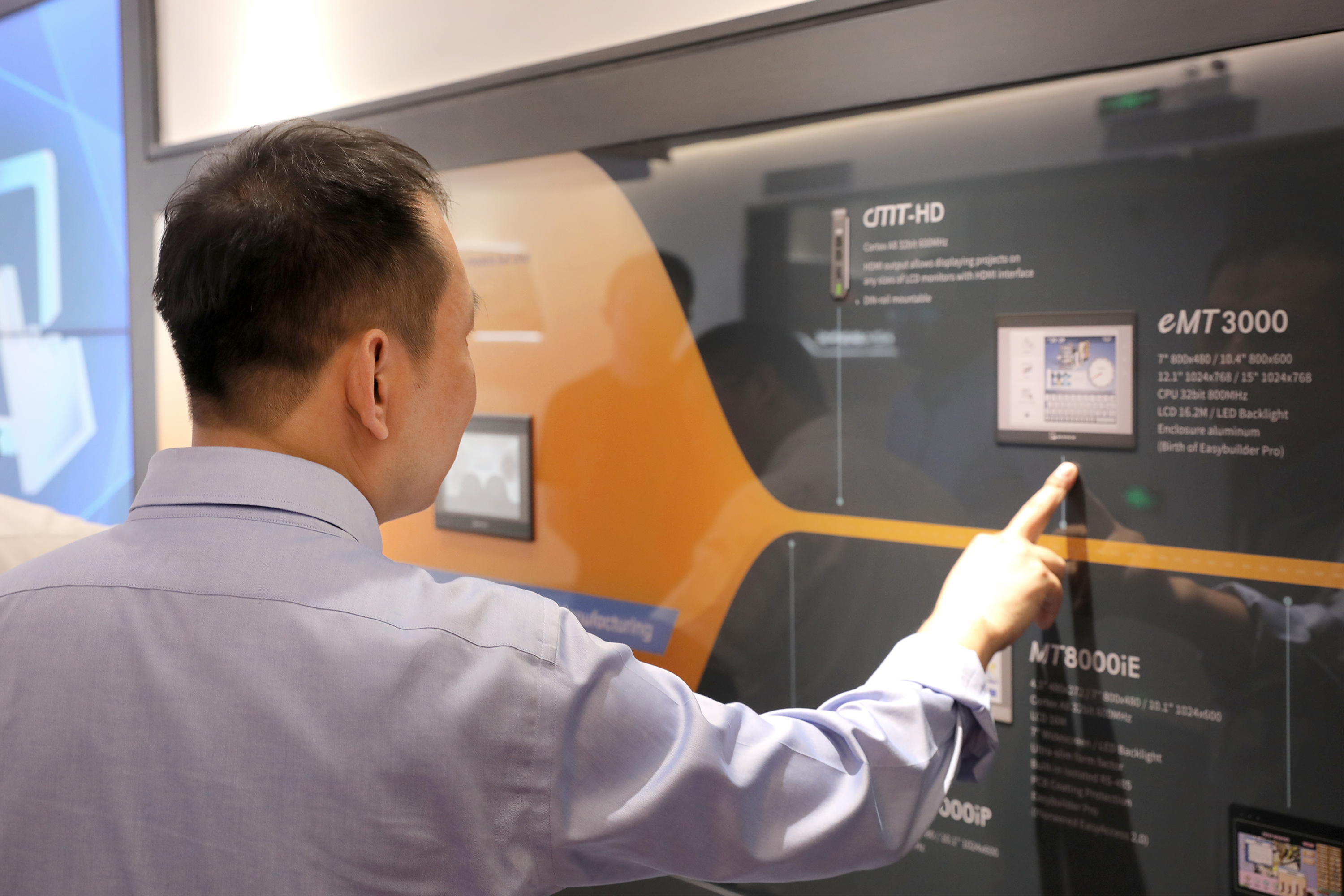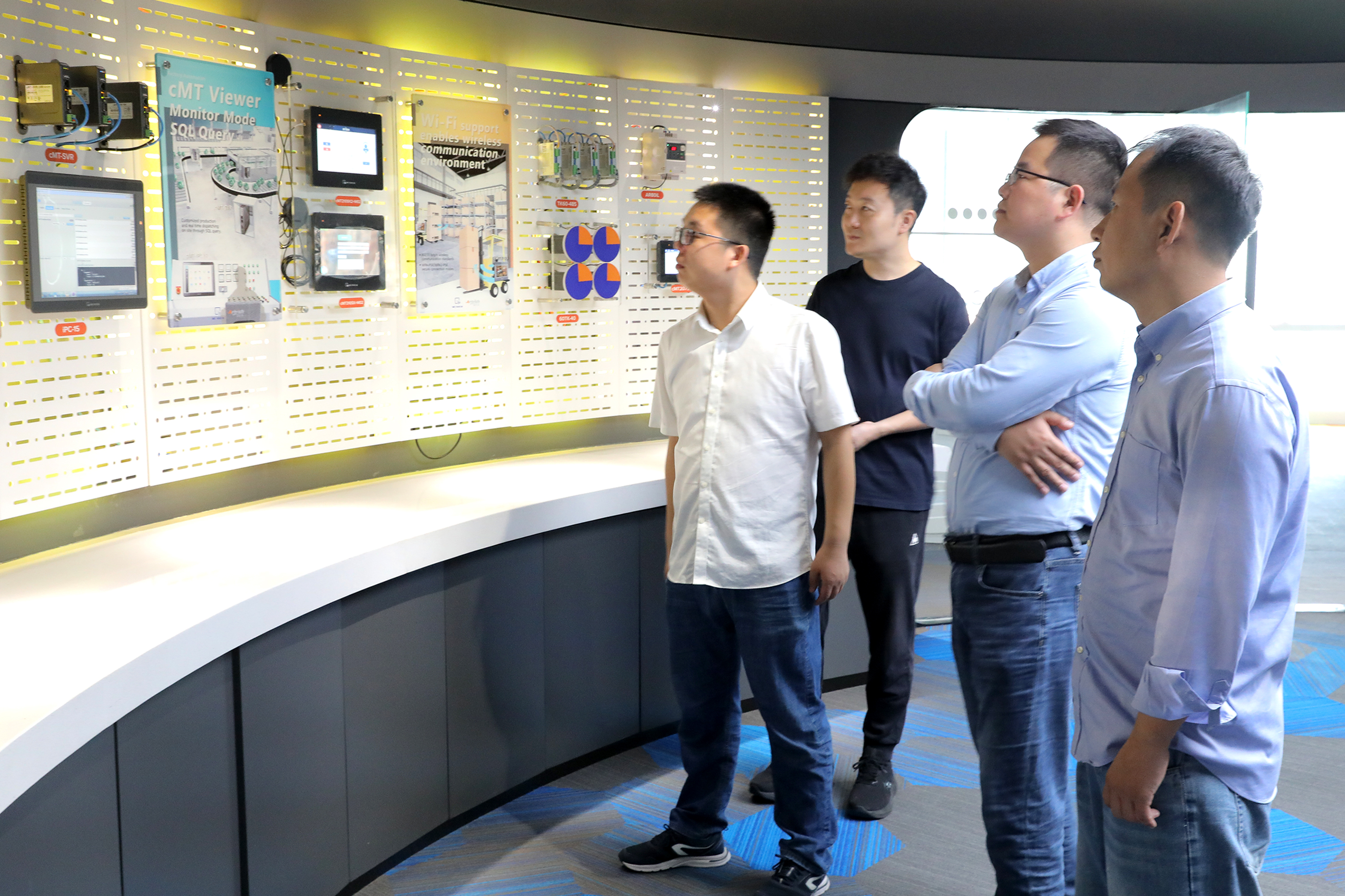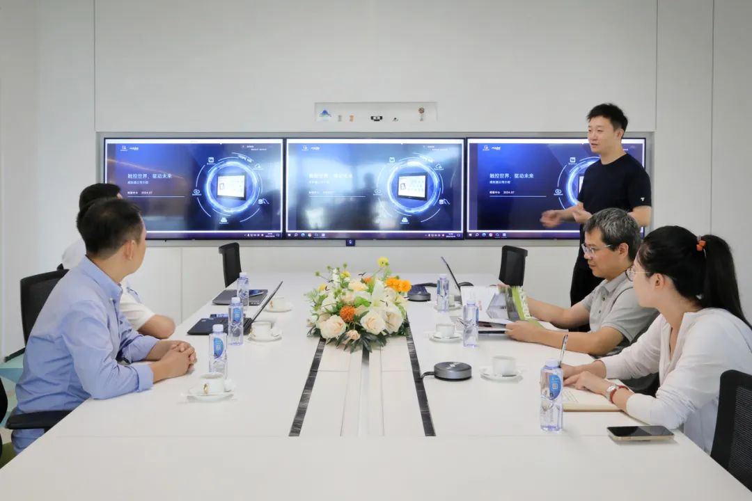 參觀過程中,劉成林向來訪領導介紹了威綸通企業發展歷程以及新一代cMT X系列云端監控HMI產品,通過現場演示與互動體驗,展示威綸通完全運用自主控制系統(HMI+I/O)結合CODESYS軟PLC方案實現的對現場能源管理、照明、空調、窗簾、電源、音響等設備進行管理的自動化智能辦公系統。讓HMI與CODESYS相結合的優勢展露無余。CODESYS(歐德神思)對威綸通的創新能力和研發實力給予了高度的認可。