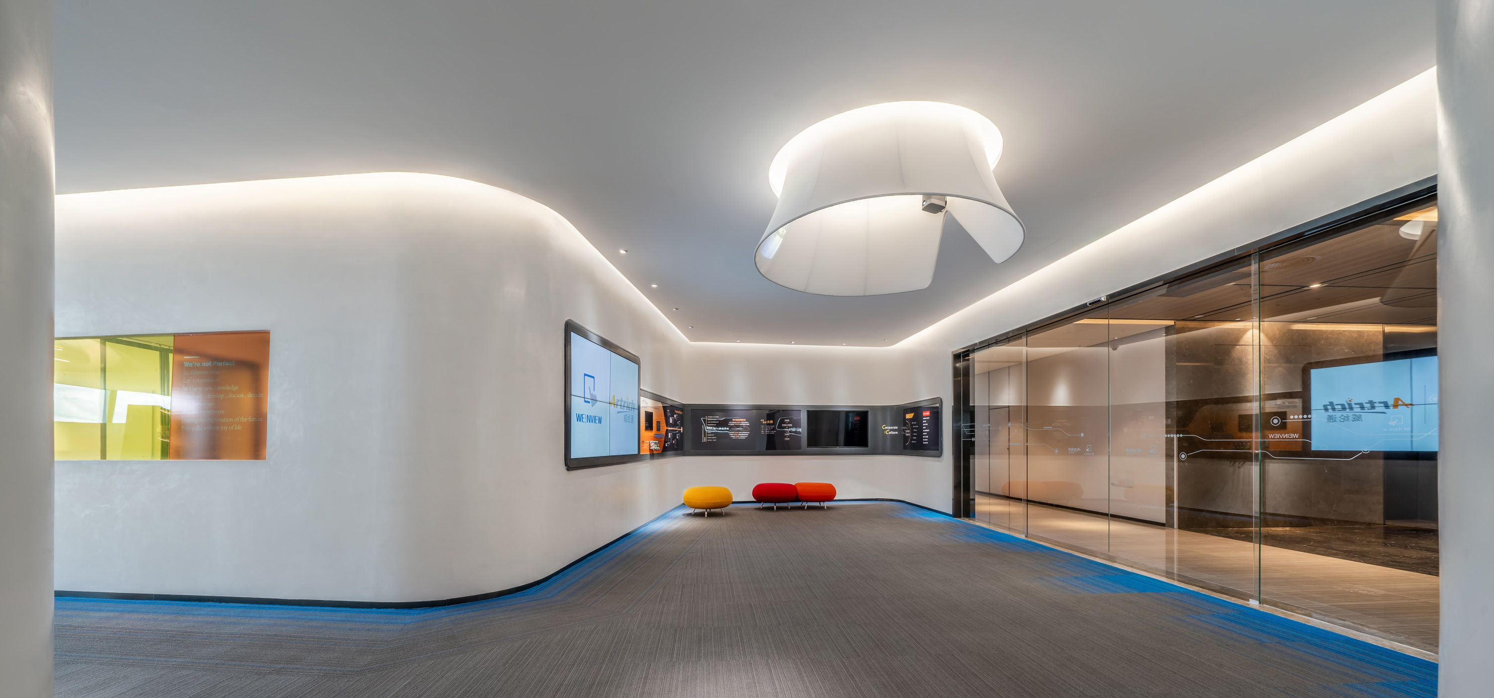 釆用簡約白作為主色調,搭配科技灰輔色調,擺脫復雜設計和過多裝飾,用藝術和生活美學及柔美線條,引入探索且流暢的動線設計,以不同的展示形式進行匹配,呈現出簡潔明快的視覺效果,彼此呼應,展現科技與現代感的平衡與協調。